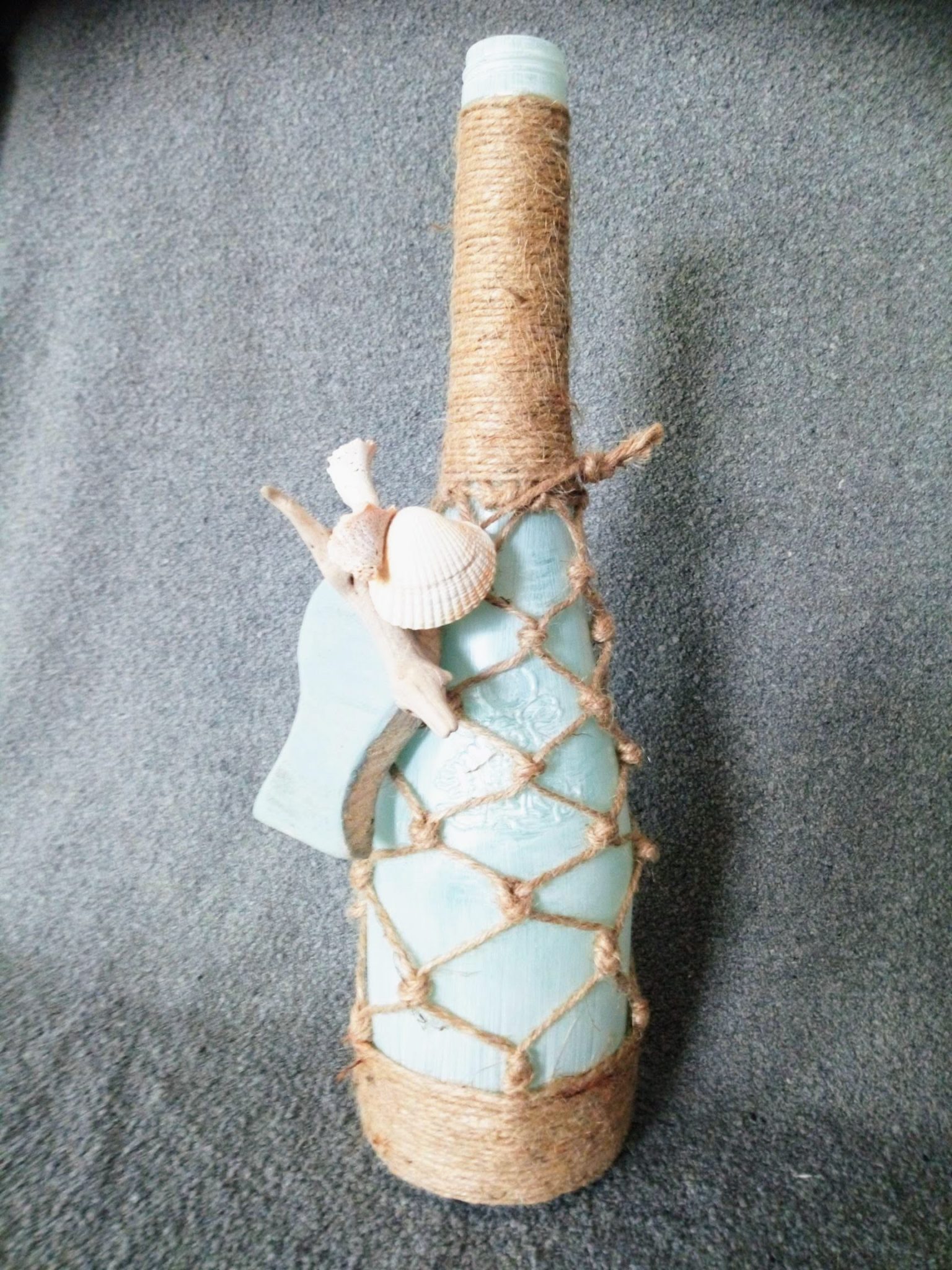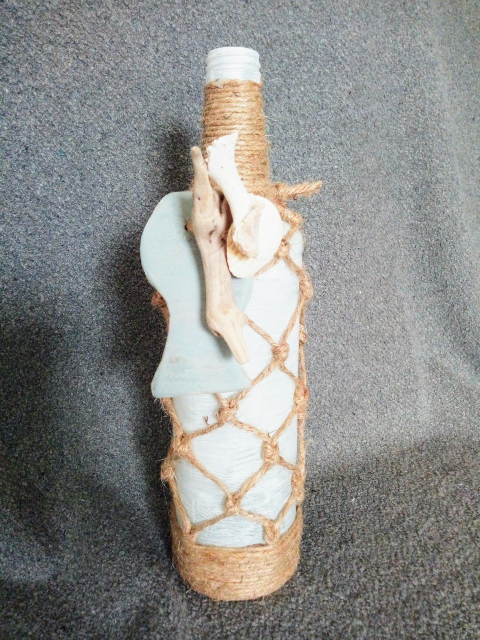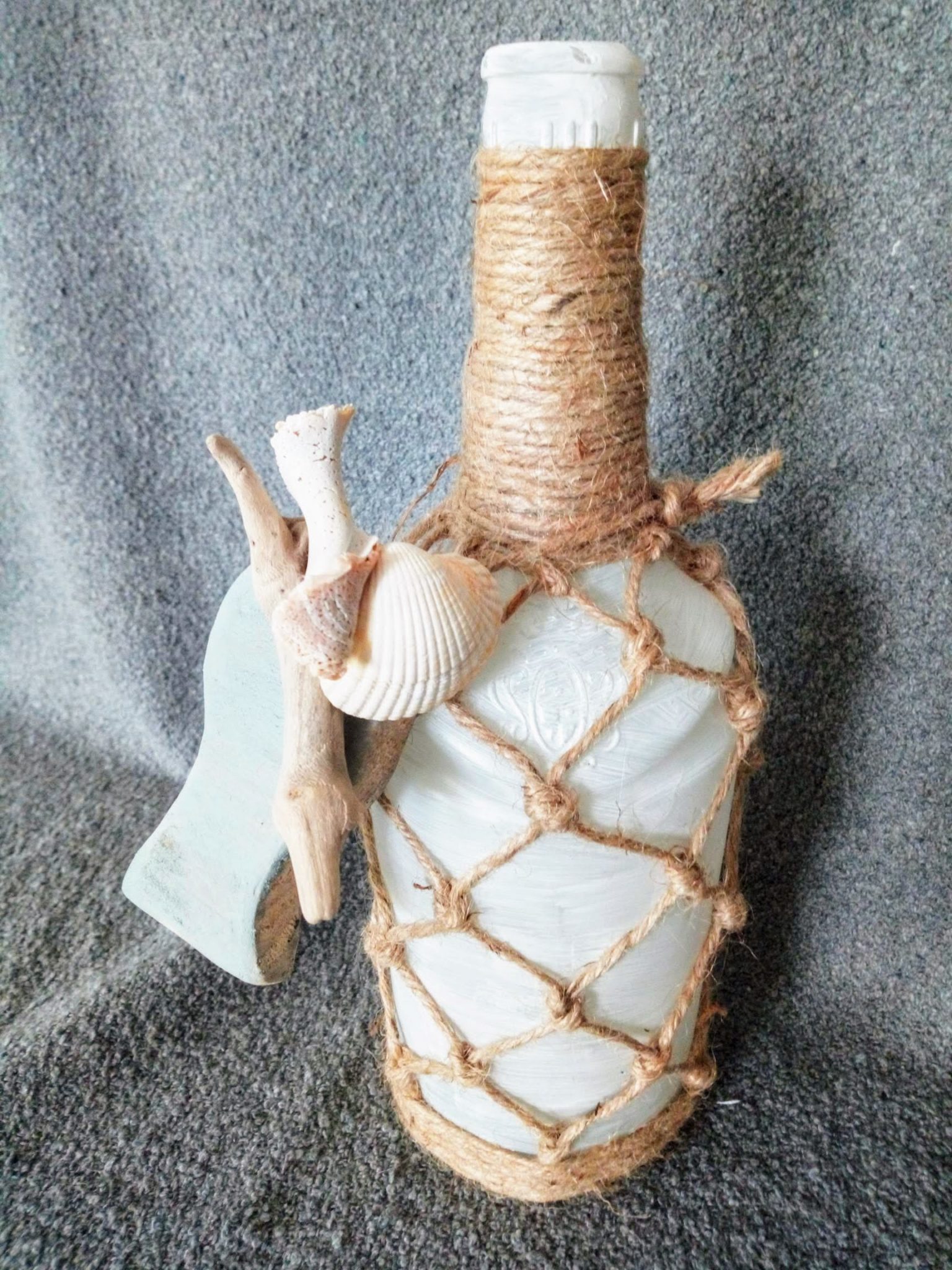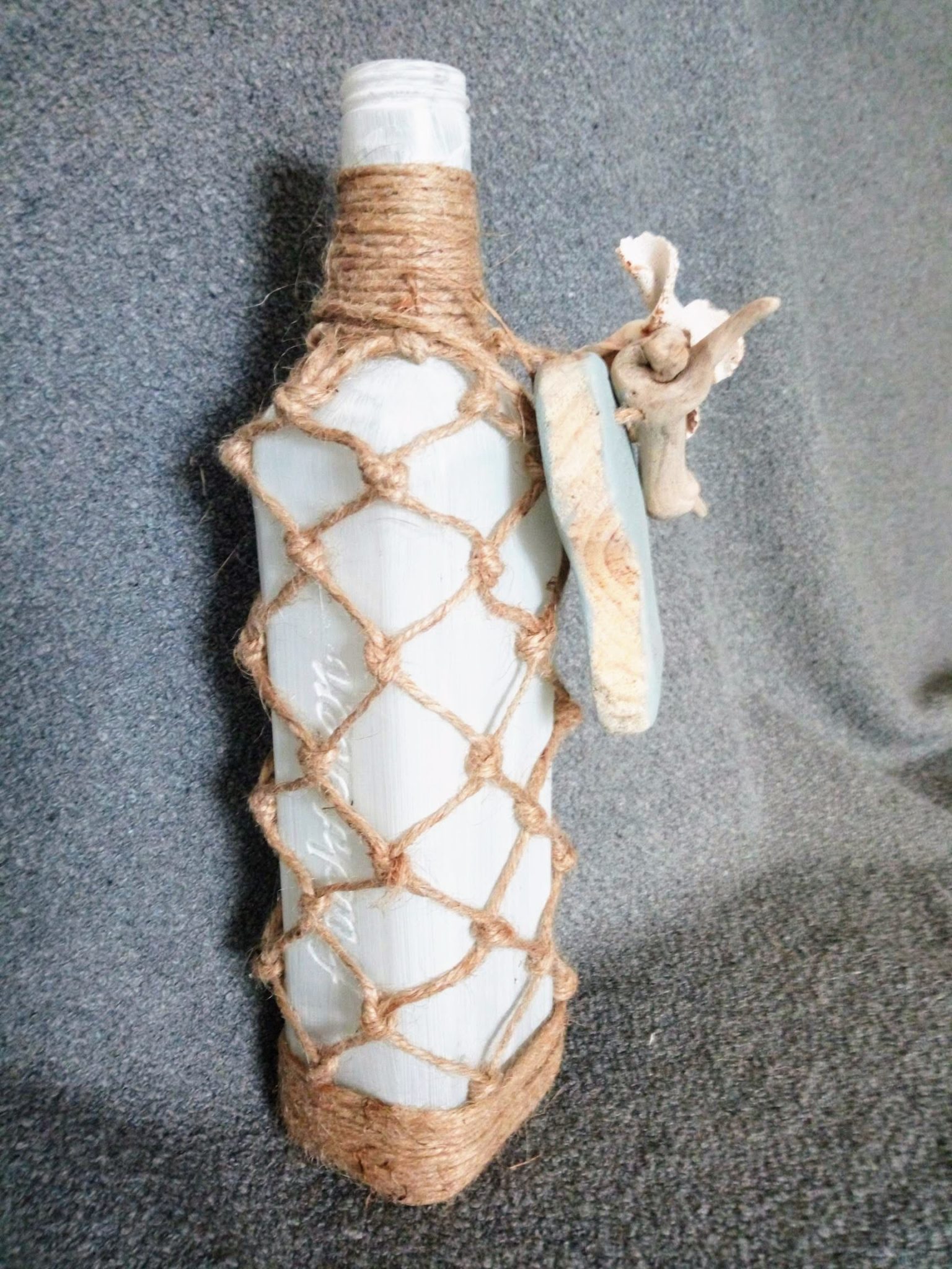 Fles macramé met houten vis, schelpen en drijfhout als decoratie. De fles is verkrijgbaar in verschillende vormen.