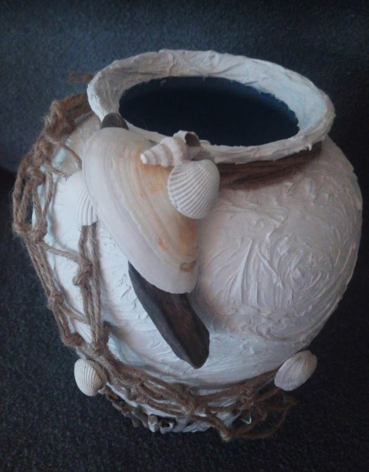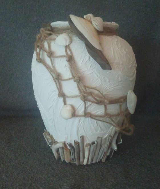 Deze glazen vaas heeft een zon-zee-strand uitstraling gekregen door het gebruik van verschillende materialen,als schelpen, touw en drijfhout