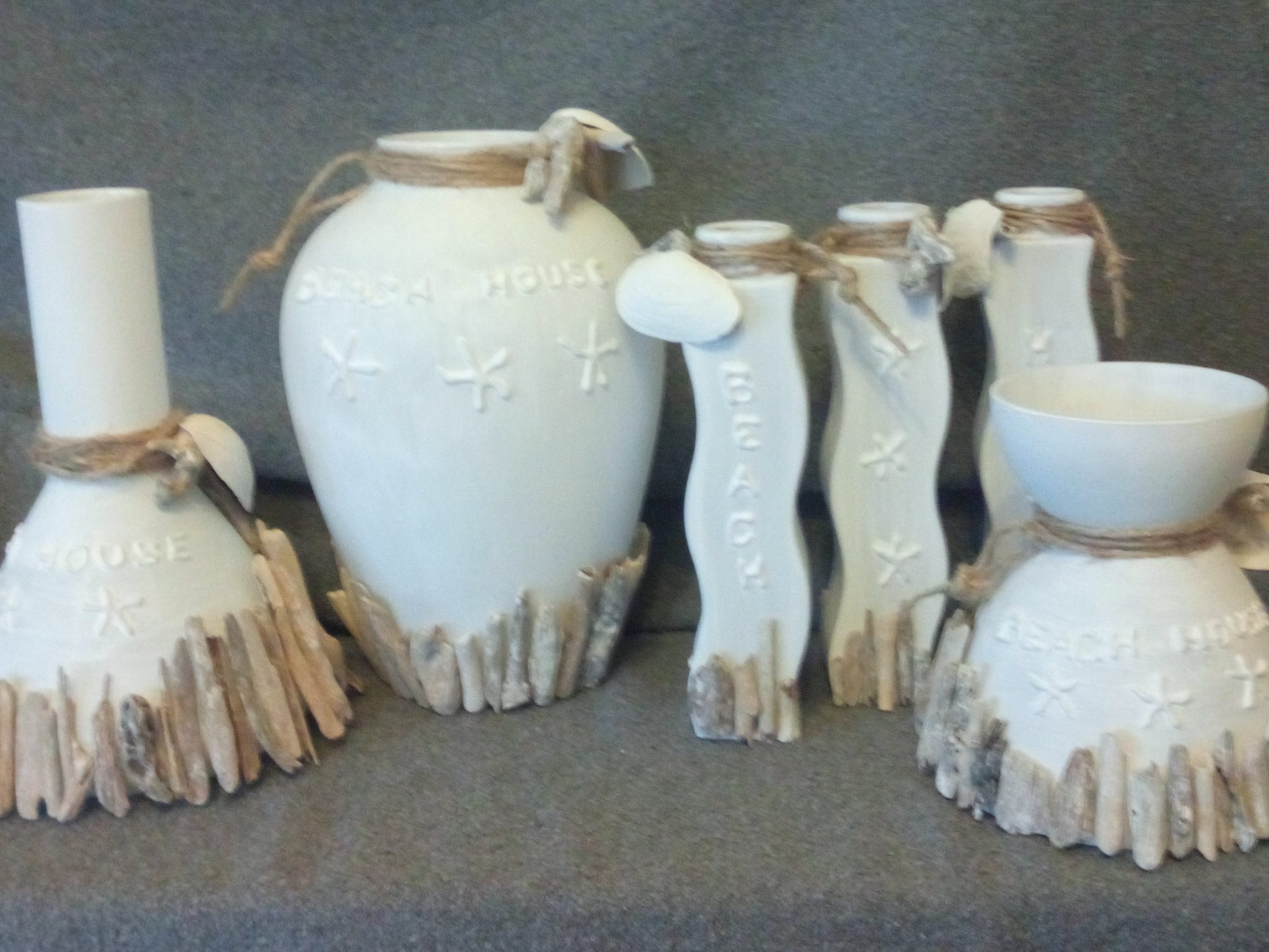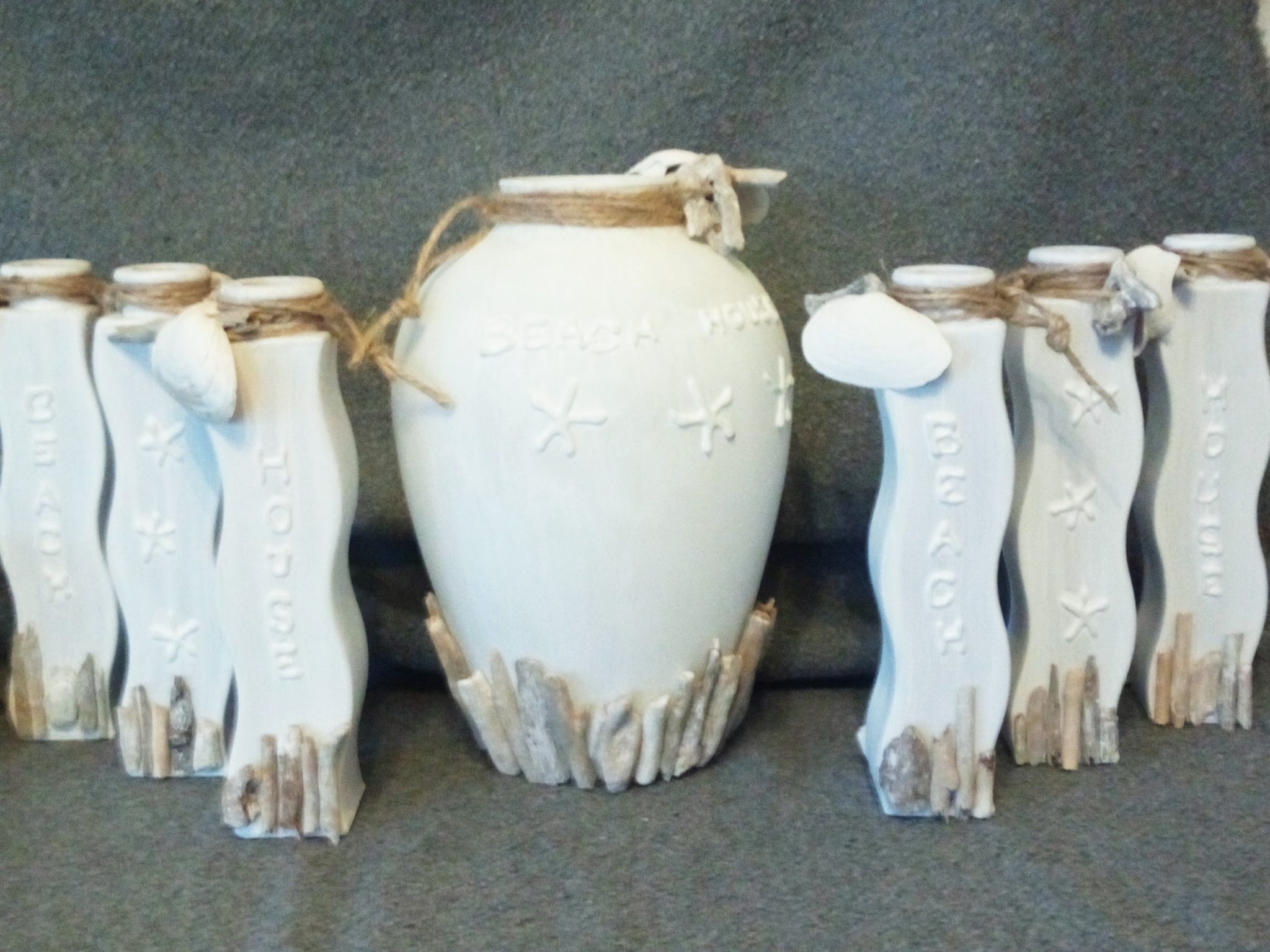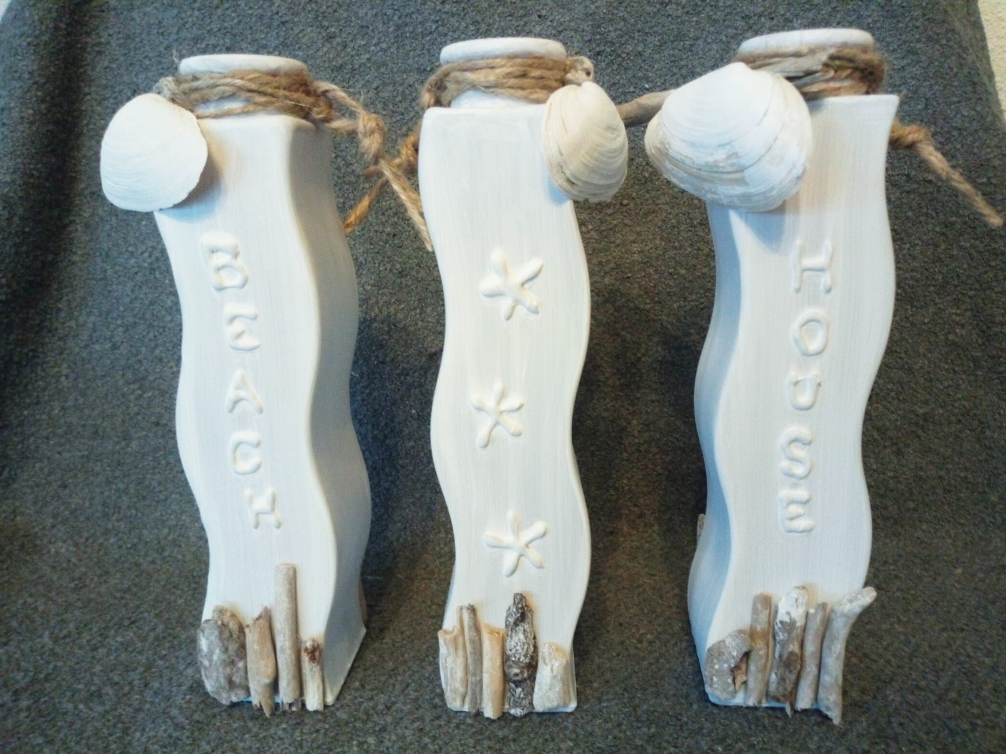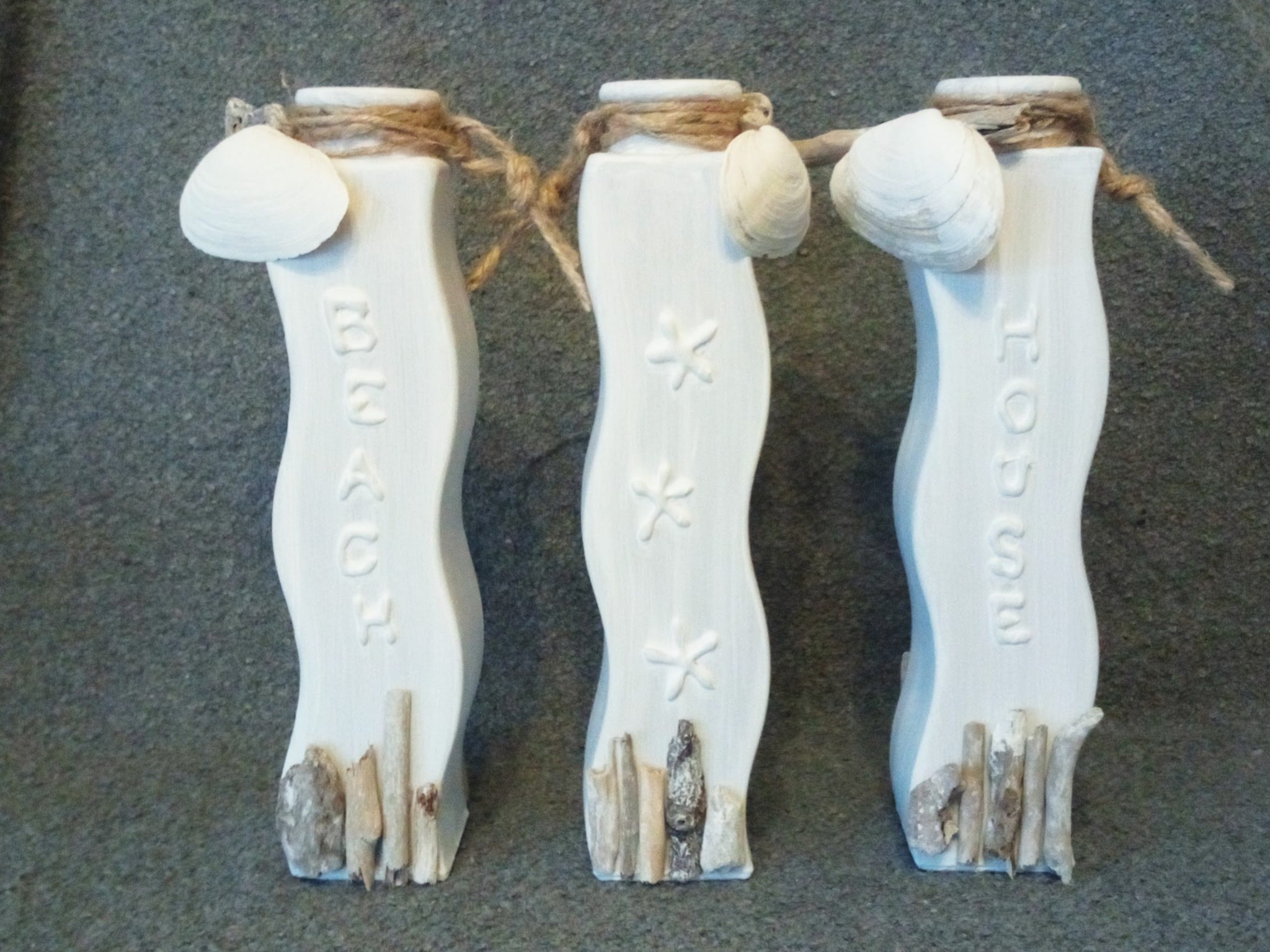 Deze set van 3 glazen vaasjes heeft een zon-zee-strand uitstraling gekregen door materialen te gebruiken die op het strand te vinden zijn.