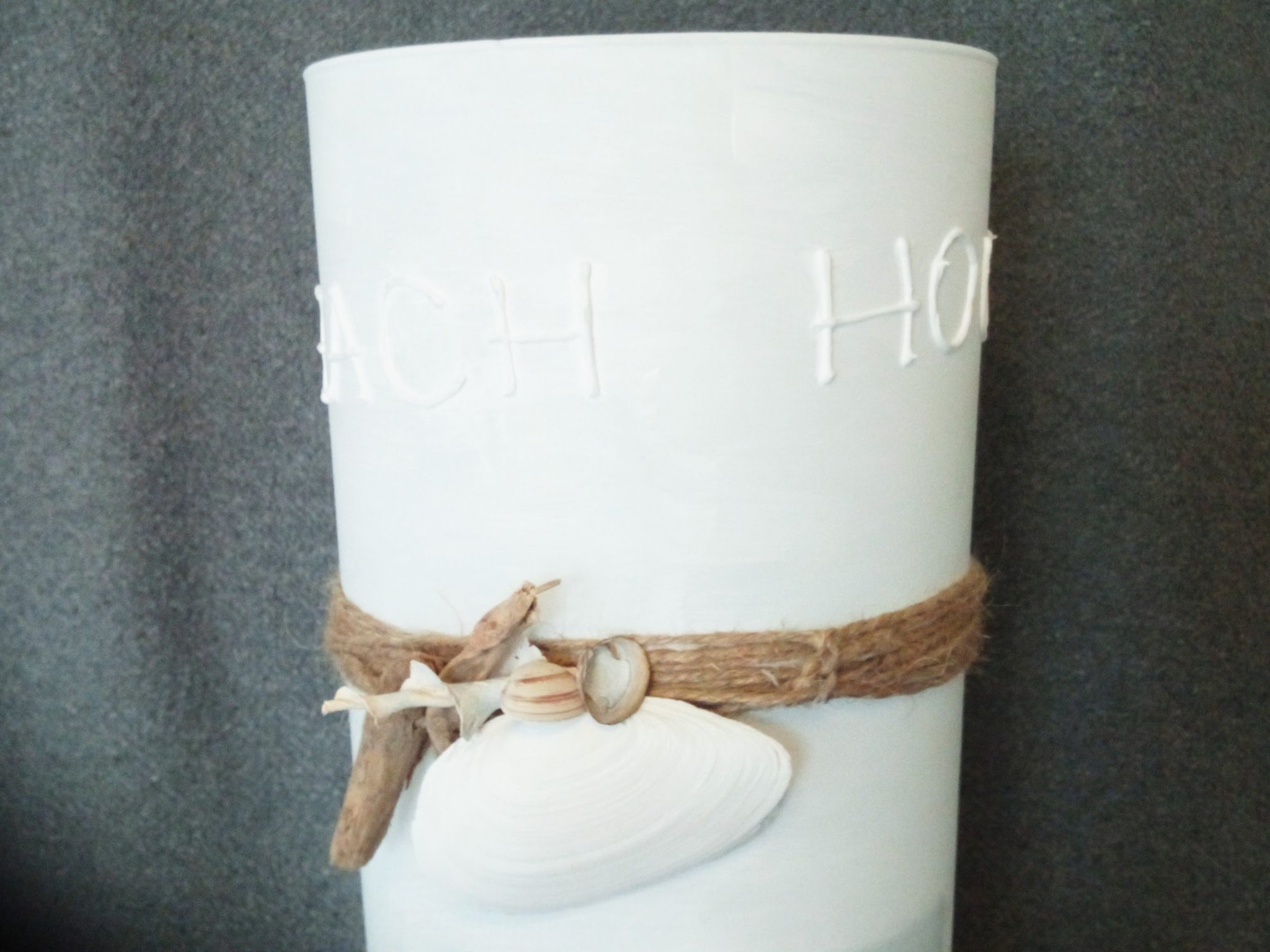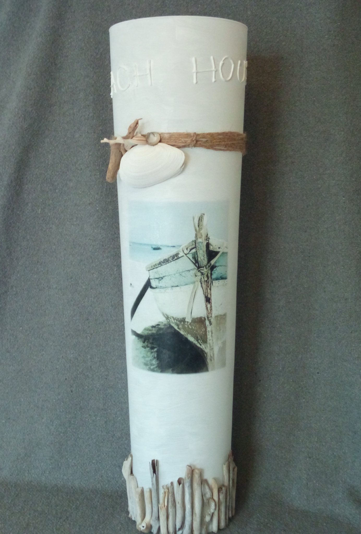 Deze glazen vaas heeft een zon-zee-strand uitstraling gekregen door het gebruik van verschillende materialen en is voorzien van een afbeelding