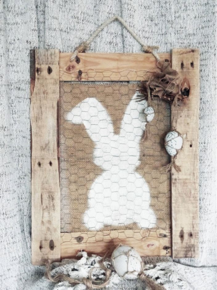 Deco-bord – Pasen “raster konijn” is gemaakt van pallethout en kippengaas. Achter het gaas is een handbeschilderde jutedoek met afbeelding van een konijn gespannen. Standaard geleverd zonder accessoires.