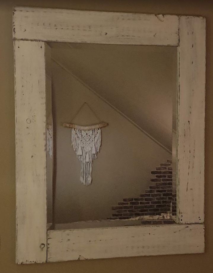 De omlijsting van deze spiegel is gemaakt van schuttinghout, dat vervolgens is geverfd en geschuurd, waardoor een landelijke stijl onstaat.