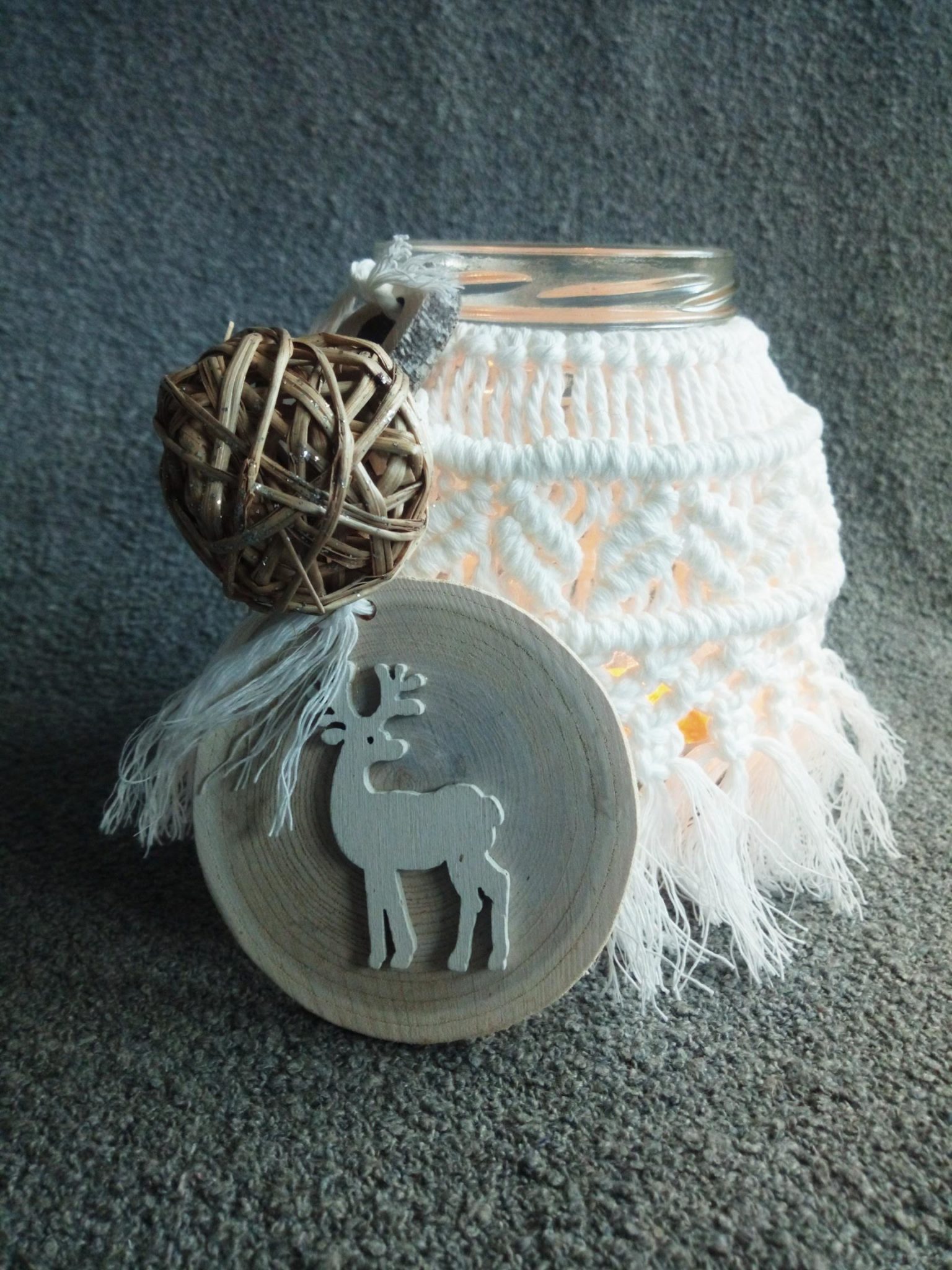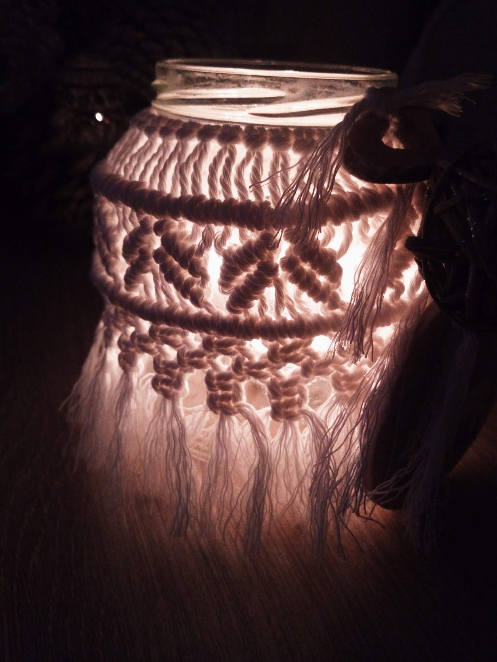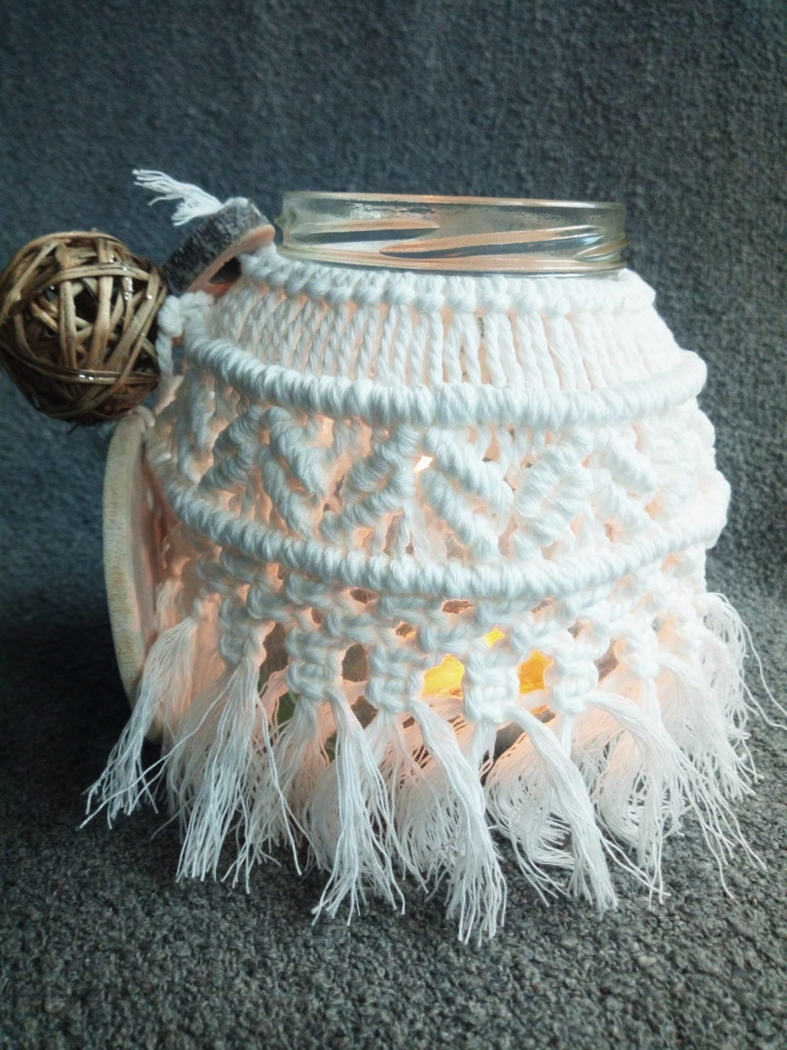 Glazen windlicht voorzien van macramé. Gemaakt met 100% cotton 2mm wit macramé touw. Met een kaarsje creëer je zo een super romantische sfeer in huis.