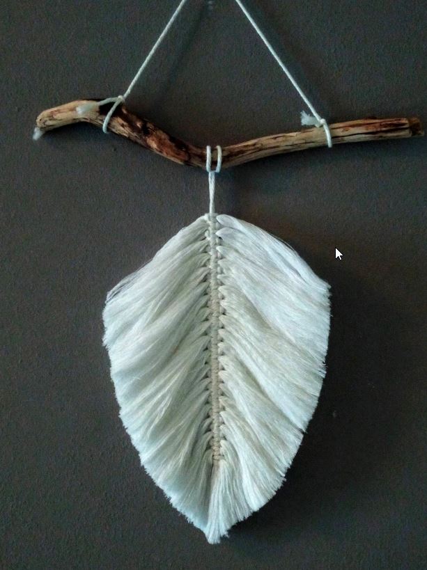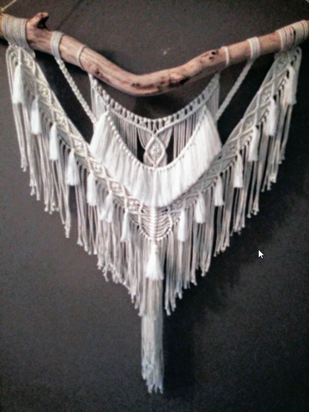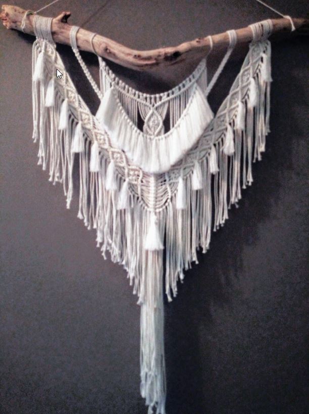 Macramé: Wandkleed met veer aan stok. Gemaakt van 3mm dik wit macramé garen. Het kleed hangt aan een grote geschuurde tak en bijpassend grote “Bohemian” veer.