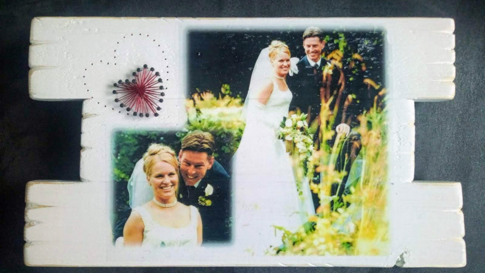 Herinneringsbord / deco-bord ter herinnering aan de huwelijksdag, gemaakt van vurenhout met foto’s van het bruidspaar.
