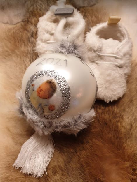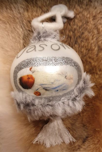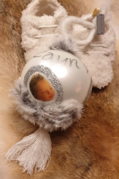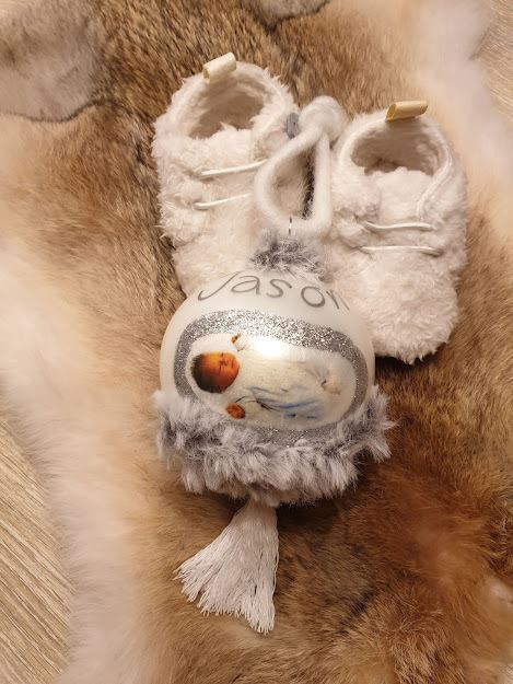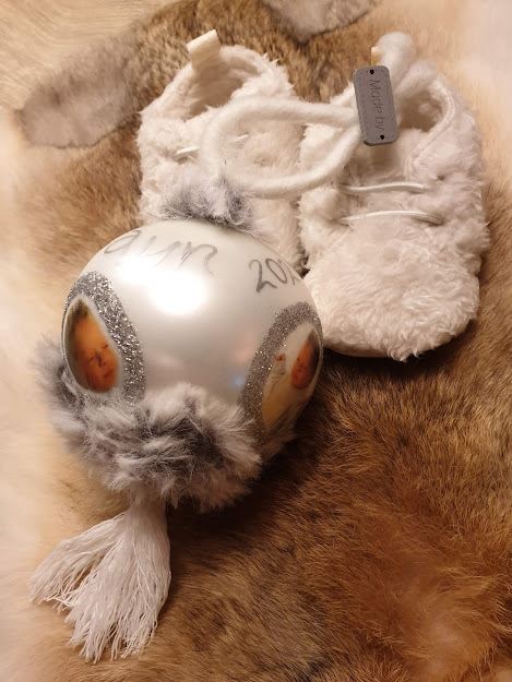 Deze echte glazen kerstbal is voorzien van een drietal fotootjes. De naam van de baby en het jaartal staan erop en de kerstbal is verder versierd met macramé, breigaren en glitters.