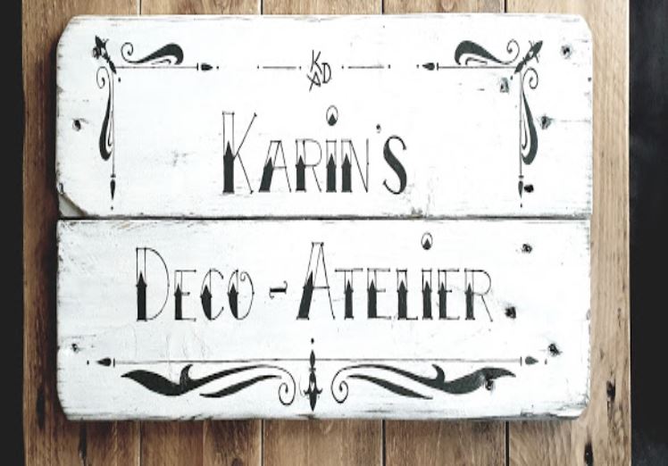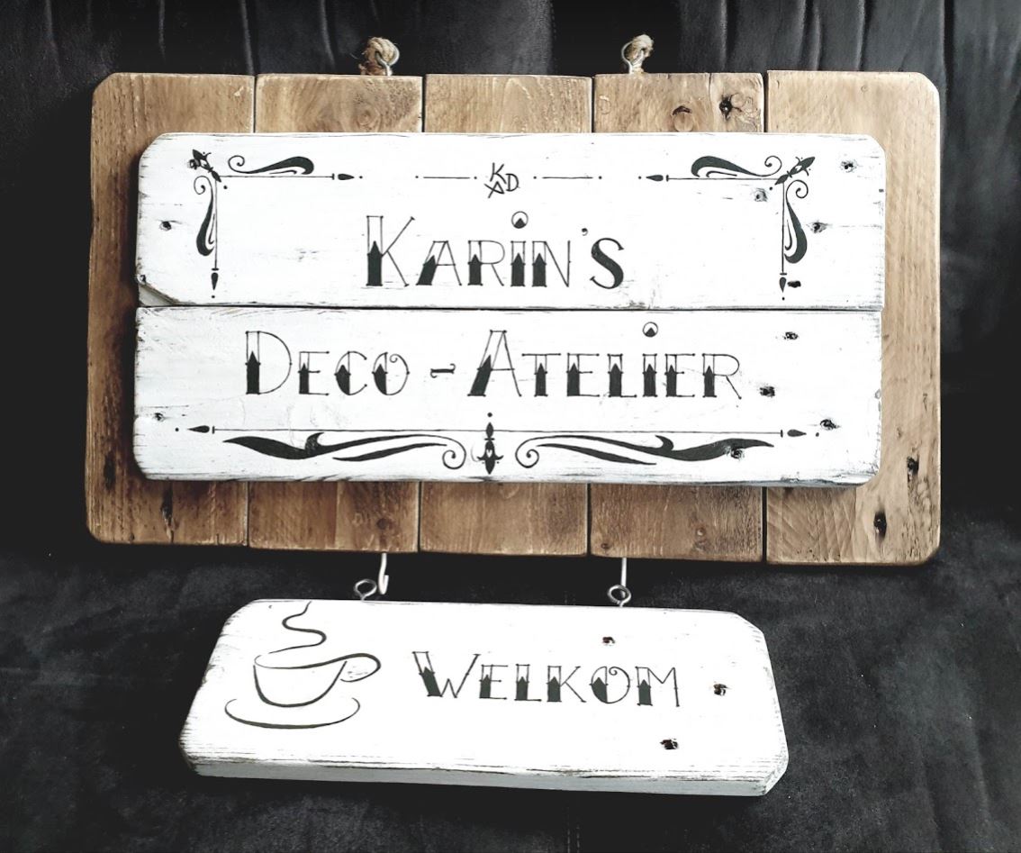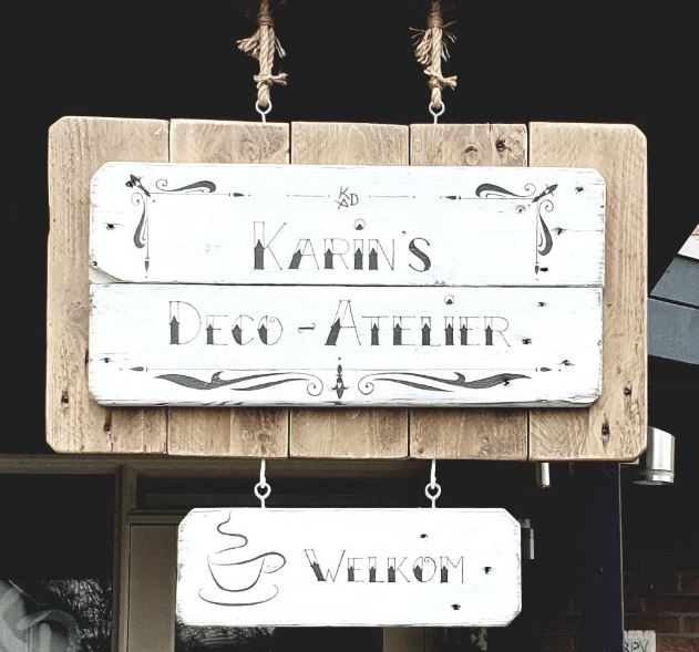 Reclamebord “Karin’s Deco Atelier” voor meer zichtbaarheid. Het bord is gemaakt van pallethout in landelijke stijl.
