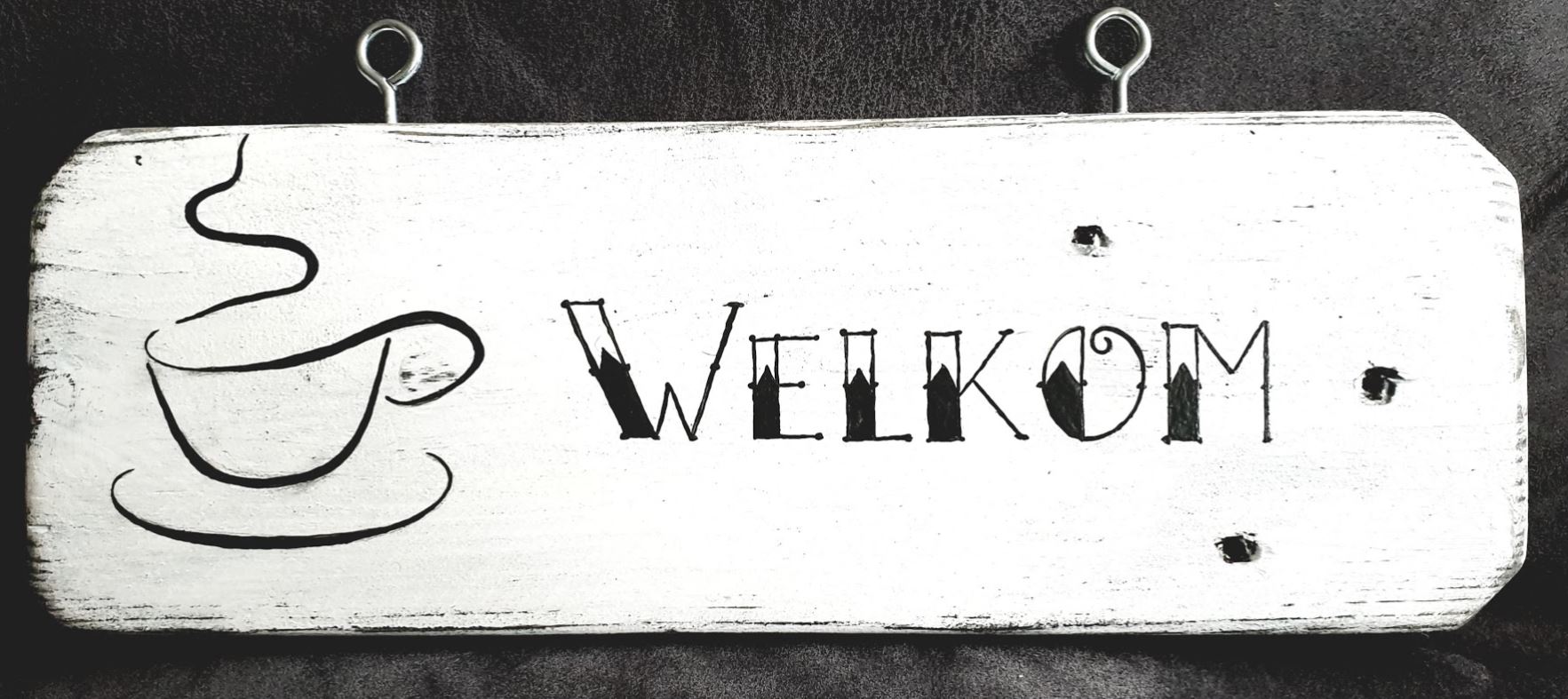 Het welkomstbordje is er met haken onderaan bevestigd.