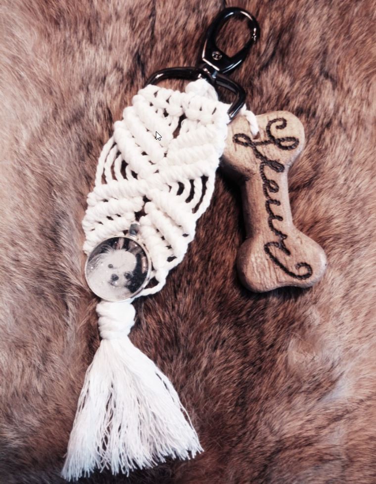 Sleutel of tas-hanger gemaakt van Macramé cotton garen 2 mm. De afbeelding is met epoxyhars en glitters in een medaillon gegoten. Als decoratie een houten bot gemaakt van vurenhout met naam erop geschilderd.