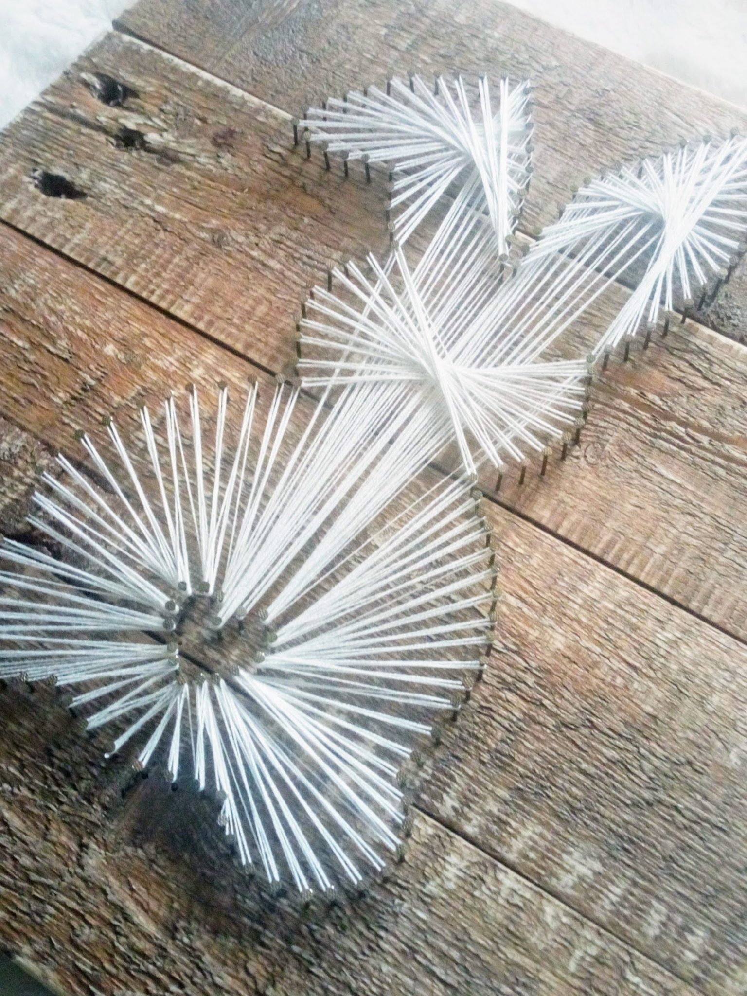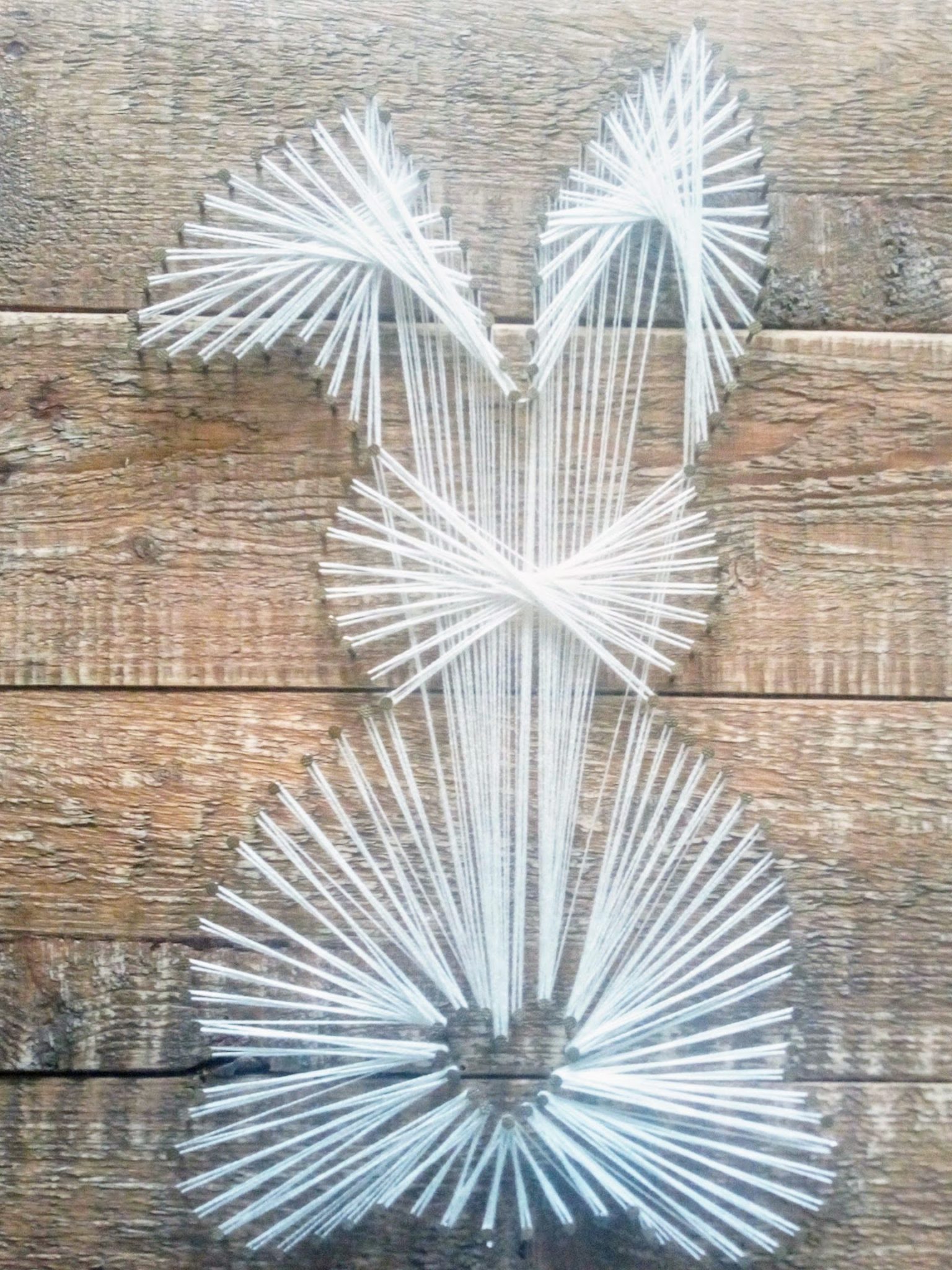 Dit lieve String-art paaskonijntje is vereeuwigd op pallethout, gebeitst en “oud” geschuurd. Het kan staan maar ook opgehangen worden.